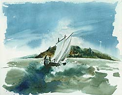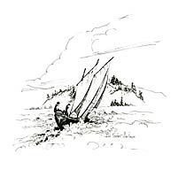 [The Elizabeth Bonaventure, and the Niña, were designed and built by my brother in his coastal B.C. Historic Watercraft Boatyard. The EB was a 26-foot replica of Captain Vancouver's yawl from the Discovery, rowing eight oars double-banked and sailing with a three-masted dipping lugsail rig. The 23-foot lancha Niña with her carved sheer and pine-tarred planking also rowed eight oars, and carried a two-masted (schooner) dipping lugsail rig. Almost 20 other replicas were being produced in many NW coastal communities including three built in an improvised street-front boatshop at the Oregon Historical Society in the heart of downtown Portland. The EB and the Niña are featured in my Ships' Boats Series in both watercolor and pen and ink and were originally made to illustrate Greg's Journal. The drawings were my very first attempt at pen and ink work.